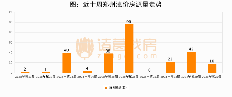 从调价房源来看,第30周郑州涨价房源18套,较上周下降57.1%。与此同时,30周涨价房源占比提升4.4个百分点,业主信心持续恢复。