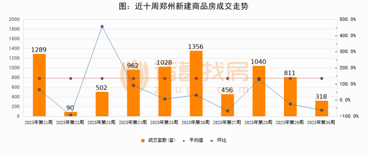 进入2025年第30周(07月21日-07月27日),郑州新建商品房成交318套,较上周减少493套,环比下降60.8%