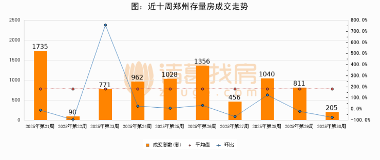 存量房方面,第30周郑州存量房成交205套,较上周减少606套,环比下降74.7%。从近十周成交走势来看,周均成交套数为845套,本周低于平均水平75.7%。