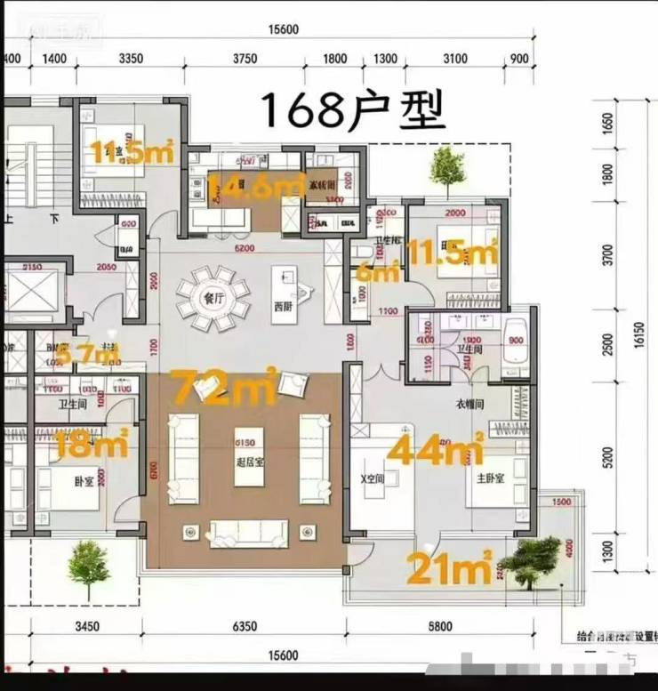 约169平四室,得房率120%左右:
